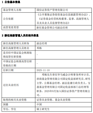 中国经济网北京11月12日电 今日,国信证券资管宣布聘任邓东为副总经理。公告显示,邓东先生曾任毕马威会计师事务所审计师、宝盈基金管理有限公司研究员、研究总监、公募基金经理、固定收益部副总监、行政负责人。